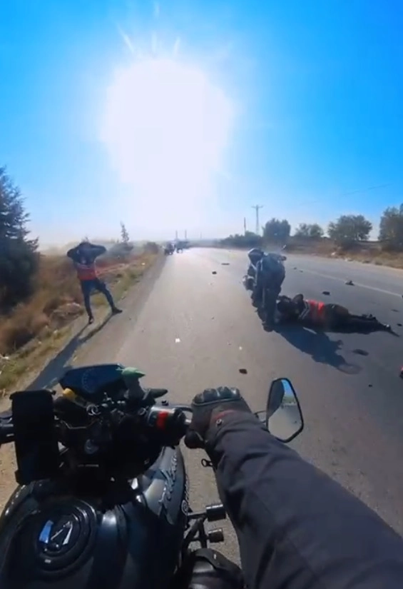 Ufuk AKTUĞ/TARSUS (Mersin), (DHA)- MERSİN'in Tarsus ilçesinde motosiklet grubuyla konvoy halinde geziden dönerken otomobille çarpışan motosikletin sürücüsü Hikmet Gürarslan (53) hayatını kaybetti, beraberindeki Tolga Cugun (27) ağır yaralandı. Kaza, güvenlik kamerasına yansıdı.